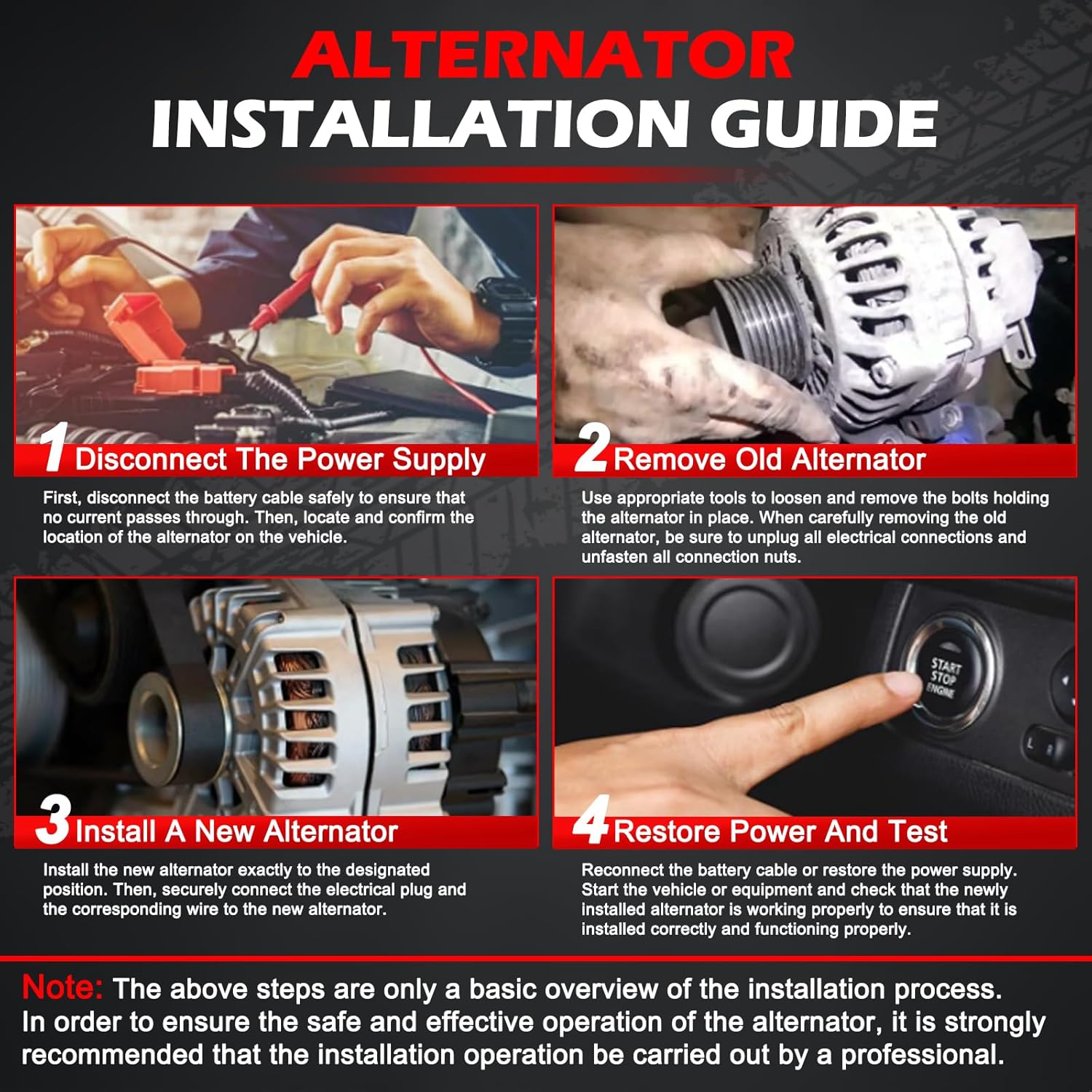 ---Autodevil 11096 140Amp Alternator--- Fitment: for GTO 2004 5.7L OE Part Number: 11096, 11096N, A003TA7991, 92058857 Specification: Amperage:140A Voltage: 12V Pulley Groove Quantity: 6 Rotation: CW Regulator: IR Fan: IF Condition: New Note: please carefully check the picture, OE number, year, make and model number to make sure they match the original part. Core Advantages of Our Alternator: (1)Stable Power Output: Precision voltage regulation ensures consistent power supply Maintains optimal voltage for all electronic components (2)Long-Term Durability: Corrosion-resistant housing protects against environmental damage Wear-resistant internals extend service life (3)Efficient Performance: Optimized design improves fuel economy Enhanced energy conversion reduces engine load ➤HOW TO INSTALL? Step 1: Disconnect the battery and make sure to replace the alternator without voltage Step 2: Panasonic the timing belt off the alternator pulley Step 3: Remove all wires from the old alternator and loosen the bolts Step 4: Replace the alternator with a new one, tighten the bolt and screw the wire(check the pulley is aligned with the belt tensioner) Step 5: Connect the battert cable and start the vehicle to make sure it is charging.