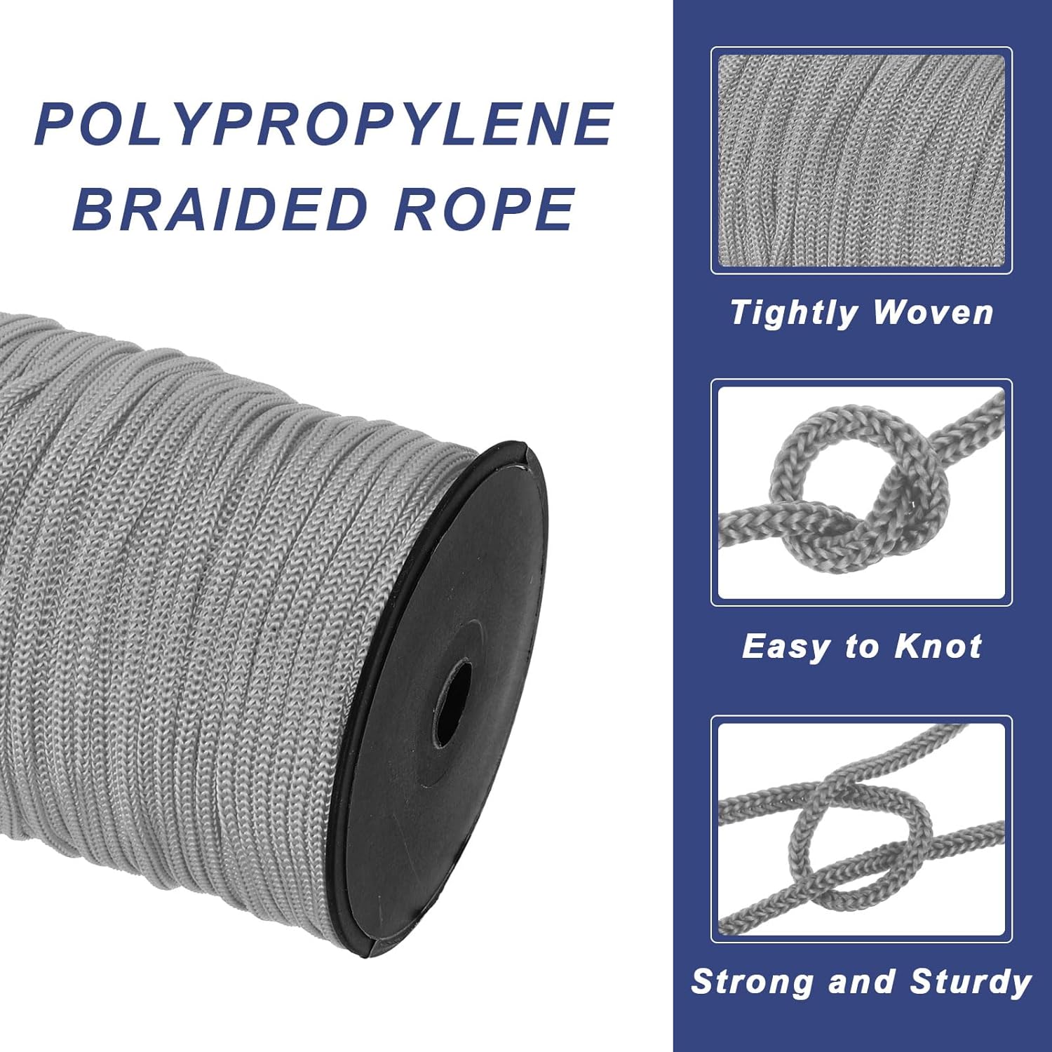 What is it? This braided nylon rope is made of polypropylene and is widely used indoors and outdoors. It can be used as a washing line and is suitable for outdoor activities such as camping and fishing. At the same time, it is also suitable for crafts and can be used for DIY design and decoration. What do I get? Polypropylene nylon rope. Length: 100m/328ft. Diameter: 5 mm (3/16 inches). Colour: dark grey. Material: polypropylene. Style: Braided Rope Package contents: 1 x polypropylene rope. Are there any advantages of the product? This braided polypropylene rope has a uniform colour and does not fade, and its variety of colours can meet different requirements. It is strong and sturdy, the rope is tightly braided and the texture is clear. How is it used? This nylon rope is strong and durable enough to be used as a washing line, camping rope, handicraft rope and outdoor activities. What should I pay attention to? Please pay attention to the length and diameter of the product and choose the appropriate polypropylene rope