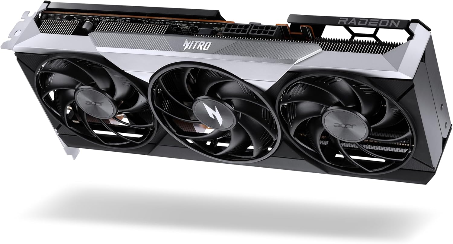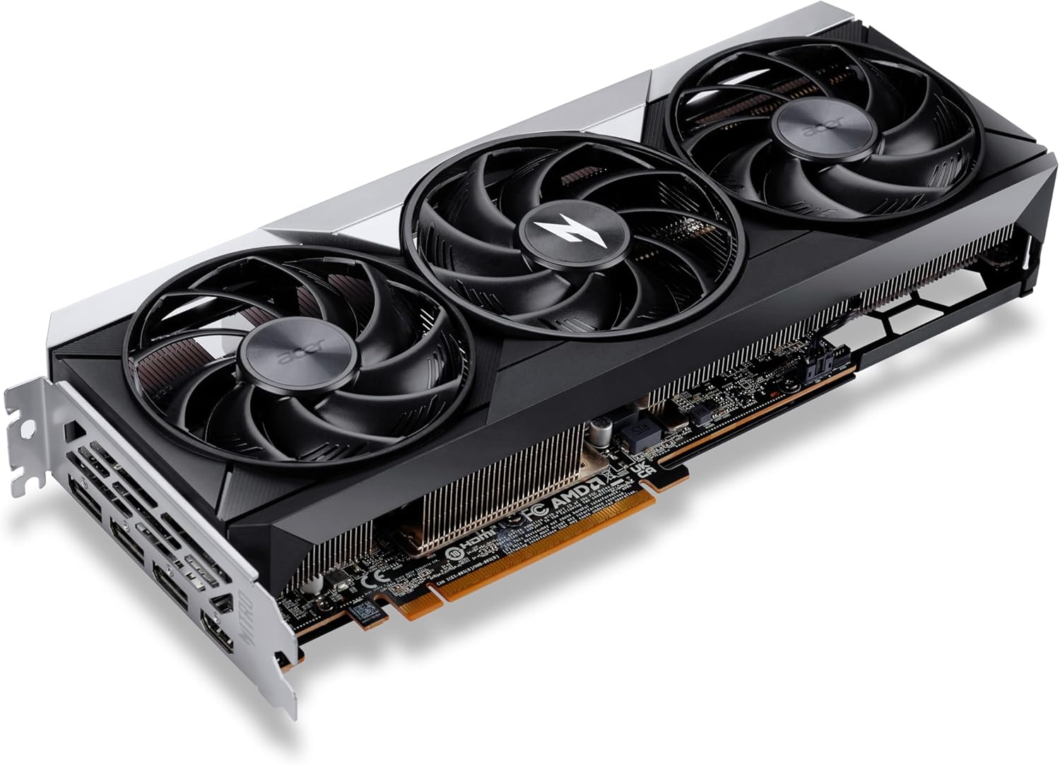 Technical data: AMD Stream processors: 3584, Base frequency: 1.44 GHz, Boost clock: 2.7 GHz, Memory bus: 256 bit, Memory bandwidth: 640 Gb/s, , Fan system: 3x Nitro FrostBlade, The Acer FrostBlade fans offer high air flow at low volume thanks to aerodynamic blades. Optimized bearings and precise rotor blades minimize vibration, while customizable ARGB lighting ensures performance, style and longevity., Image Connector: 1x HDMI 2.1a 3x DP 2.1, Internal Connector: PCIe 5.0 x16