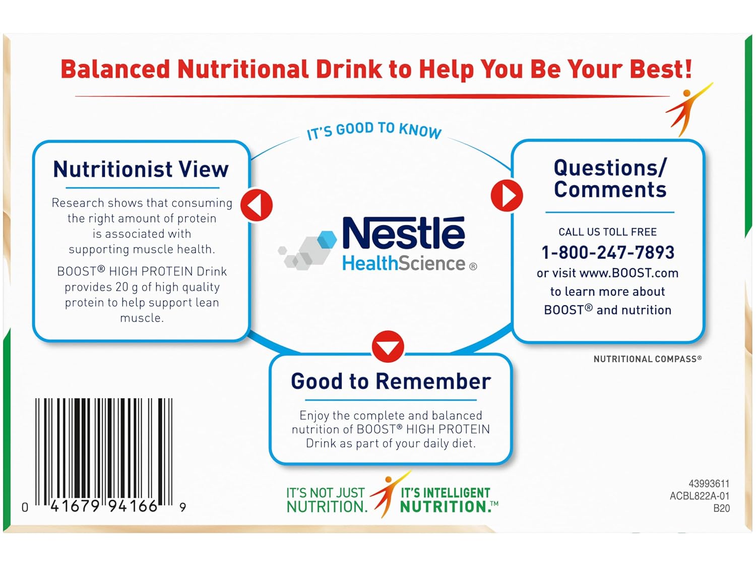 Enjoy the complete and balanced nutrition of Boost High Protein Drink as part of your daily diet. Protein is a building block of muscle, necessary to build and repair tissue. Delicious BOOST High Protein Drink is a great source of protein your body needs to maintain muscle. Boost High Protein Nutritional Drink key benefits include: 20g of high-quality protein to help maintain muscle; CalciLock nutrient blend with calcium, phosphorus, magnesium, zinc, and vitamins D, C & K to help maintain strong bones; 240 nutrient-rich calories with 8 B-Vitamins to help convert food to energy; 27 vitamins and minerals for nutrition you need each day; Antioxidants Vitamins C & E and Selenium; Key nutrients for immune support with Vitamins C & D, Zinc, Iron and Selenium. Boost High Protein Nutritional Drinks are gluten free and contain no artificial colors, flavors or sweeteners. Enjoy Boost High Protein Nutritional Drinks as a snack or mini-meal to help meet daily nutritional needs. Boost High Protein Drink comes in 3 delightful flavors Rich Chocolate, Very Vanilla and Creamy Strawberry.