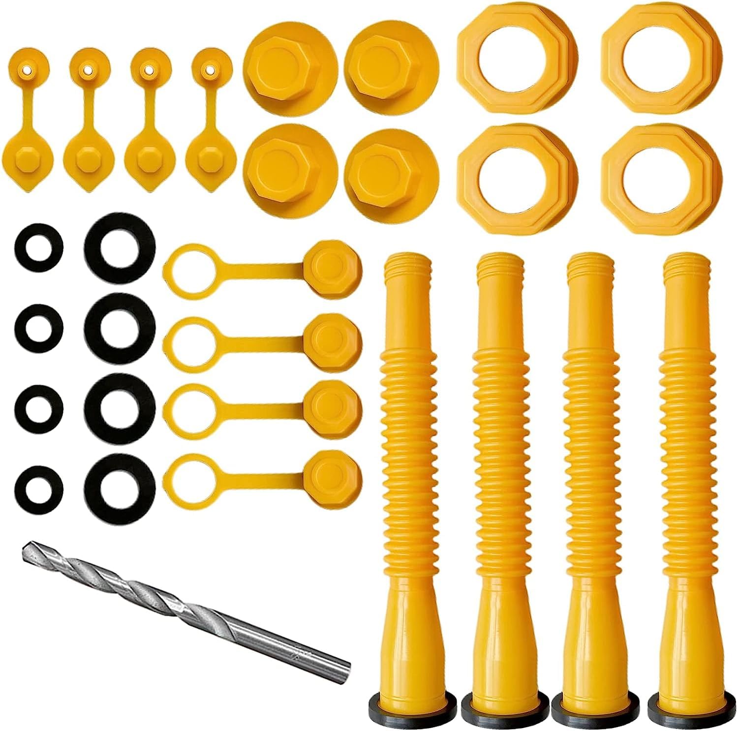 Gas Can Spout Replacement. Gas Can Nozzle. Total Length is 11.2in for Easier use. gas can Mouth Size 1.75in-1.8in can be Used. The Tube Body is Formed in one Piece and Will not Crack. With the Harpra Gas Can Spout Replacement Kit, you can say goodbye to messy and frustrating refueling experiences. Our upgraded and more compatible kit is designed to make refueling easier and more convenient. Made of high quality HDPE material, the hoses are molded in one piece, ensuring toughness and strength. Thicker and widened rubber gaskets provide a better fit for the bottle cap, preventing liquid leakage during refueling. The spout tube and cap are threaded, with a rubber sealing ring inside the cap to prevent oil overflow during transportation or when the tank is down. Each set includes 6 screw collar caps, 3 yellow spouts and rubber gaskets, 3 nozzle caps with threads, 2 types of gas can vent caps, and a drill bit for installation. If you need assistance during installation or use, our customer service team is always ready to help. Upgrade your refueling experience with the Harpra Gas Can Spout Replacement Kit today!