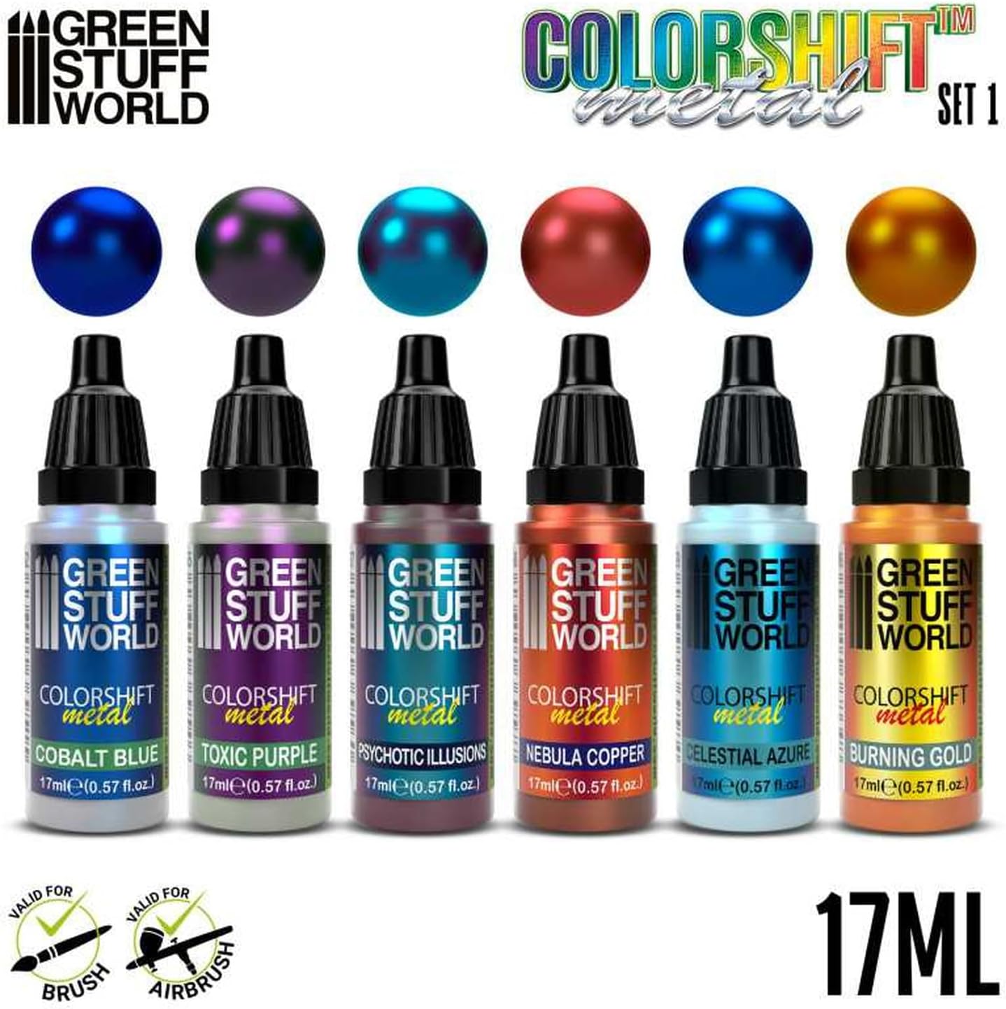 Greenstuff World "Chameleon Color Set 1 (6 pcs) hobby paint. The Chameleon Metal Color is a polarized metal color that changes beautifully depending on the angle you view it. Can be brushed or airbrushed, but the best results are achieved with air brushing. How to use: Apply black paint as a primer. We recommend using a glossy (gloss) paint. Chameleon color should be fully stirred before use. Chameleon colors are translucent and may vary depending on the color of the undercoat If you get used to it, you can try a different color undercoat for yourself. Apply as thin as possible. If the base coat color no longer visible, it is done. This set includes 6 water-based acrylic polarized chameleon metal colors. Made from the finest quality pigments Contains no organic solvents. Flame retardant, no rubber component Set Contents: 6 bottles, each 0.6 fl oz (17 ml) Burning gold 1606 Psychotic Illusion 1557 Celestial Blue 1559 Cobalt Blue 1552 Tokic Purple 1555 Nebula Copper 1558 This product is a hobby paint. Please prepare tools and other items separately. Does not include any other than this product (adhesives, paint, tools, batteries, etc.) Pack of 6, 0.6 fl oz (17 ml)