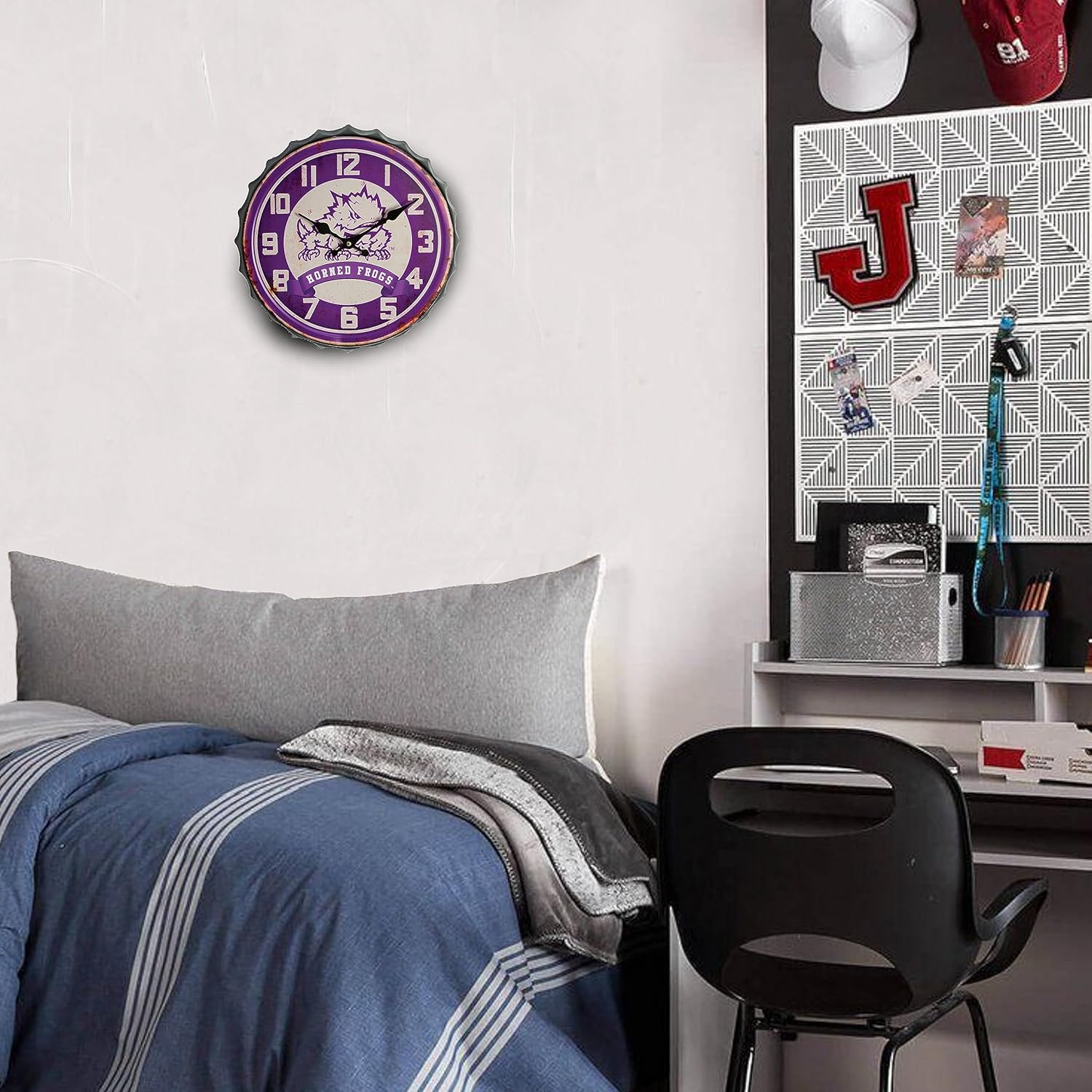 Licensed distressed metal bottle Cap shaped clock featuring collegiate colors and Logos. Perfect to hang in any room to display your favorite team.