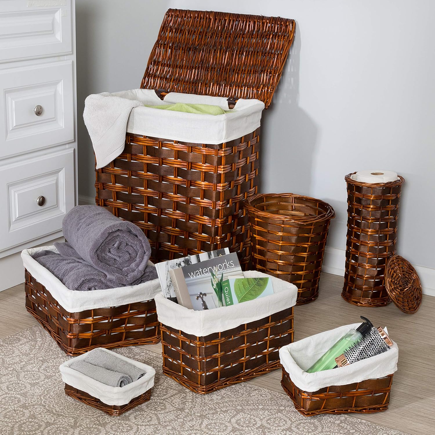 Honey-Can-Do HMP-01866 Wicker Hamper Kit, 7-Pack, 7-Piece. Wicker material will not mark or scratch your floors. Virtually unbreakable material, hamper kit is constructed to last. Hamper combines function and stylish design, fits well with most home décor. Allows air to pass through and is breathable, helps to prevent odors from building up. Comes with rectangular hamper, large basket, mini basket, magazine basket, vertical toilet tissue bin, media holder, and waste basket. Measurements of items included - Rectangle Hamper: 18-1/2-inches L by 12-inches W by 22-inches H / Large Storage Basket: 15-inches L by 11-inches W by 7-Inches H / Mini Basket: 7-1/2-inches L by 5-1/2-inches W by 3-inches H / Magazine Basket:13-inches L by 7-inches W by 8-inches H / Upright Toilet Tissue: 6-1/2-inches L by 6-1/2-inches W by 15-1/2-inches H / Media Holder: 7-inches L by 9-inches W by 4-inches H / Waste Basket: 10-inches L by 10-inches W by 11-inches H.