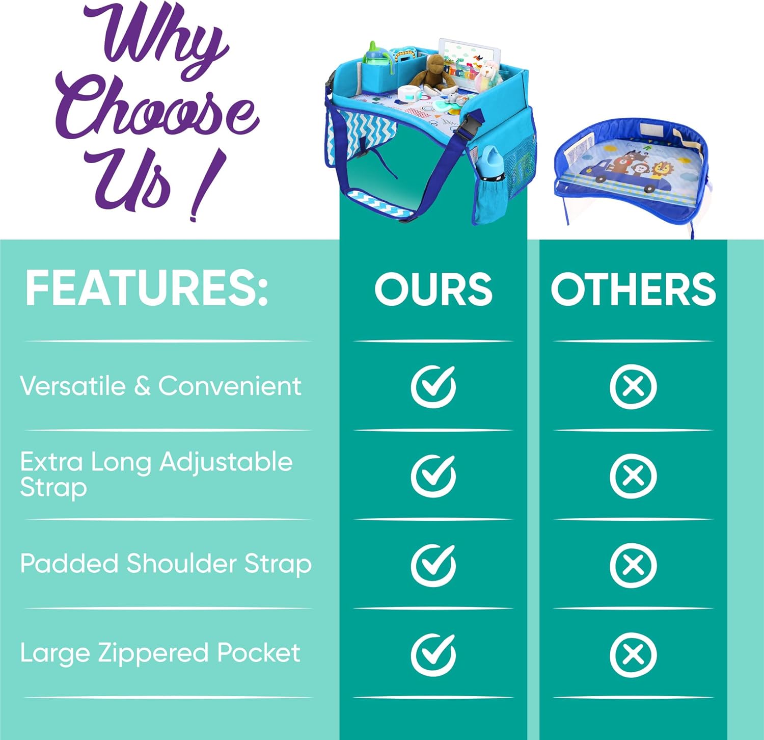 | Other Special Features of the Product | Adjustable Padded Shoulder Strap, Clear Tablet Holder, Detachable Side Storage, Large Cup Holder, Use Tray for Playing or for Food/Snacks |