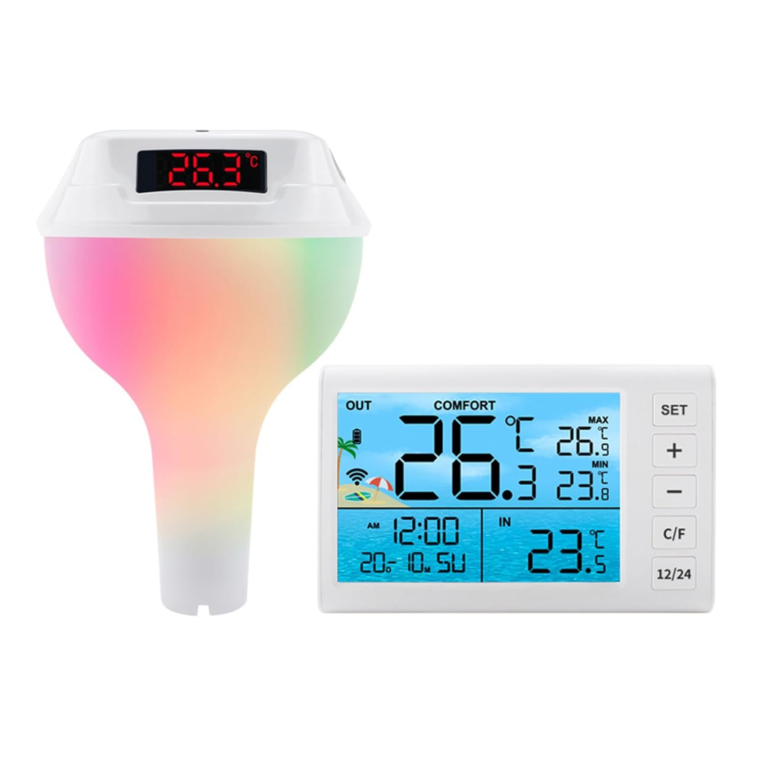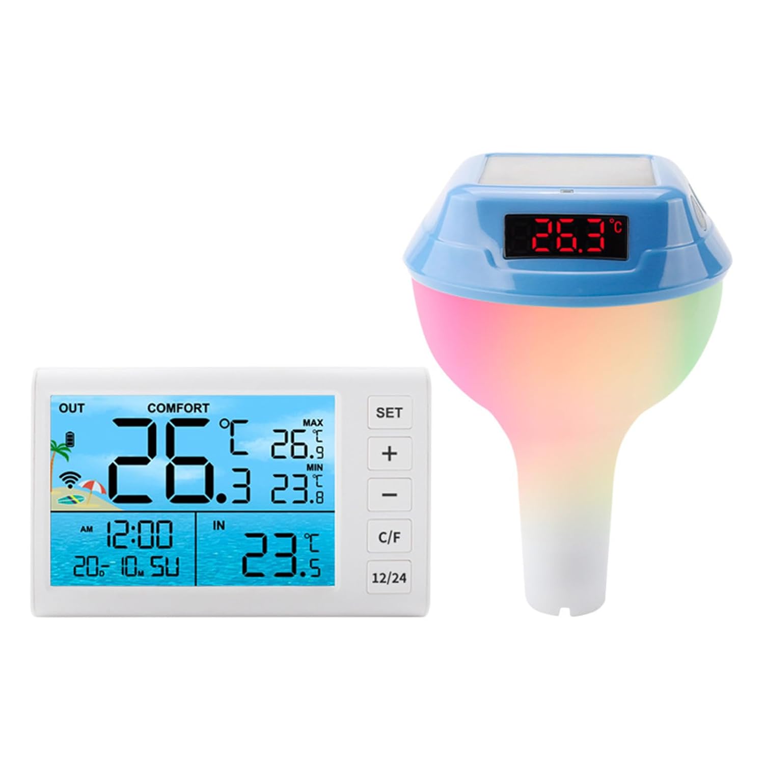 LED LED Pool Thermometers With Solar Charging And IP68 Design For Swimming Pool Aquariums AccessoriesFeatures:Illuminates your pool with the Solar Power Supply Pool Thermometers , featuring easy read digital thermometers and IP68 LED light that changes color, perfectly for enhancing your swimming This Pool Thermometers is design with a robusts solar panel and builts in 2200mAh battery, ensuring continuous operate and vibrantly LED lighting effect that can be customizes to suit your mood.Ideal for pool owners and spa enthusiasts who seek both functionality and ambiances, this device caters to those who appreciate innovative for maintaining and inviting water for nighttimes swimming or spa relaxation, the floater provide accurate temperature readings and a captivatings light shows, transforming any pool party into a memorables event.With its durability ABS construction and advanced transmission capabilities, this pool accessory combines practicality with aesthetic appeal, making it a addition to your outdoor decors.Specifications:Component Receiver Size:Approx.13.5x2.6x8.4cm/5.31x1.02x3.31inchThermometers Size:Approx.11.1x3x16cm/4.37x1.18x6.3inch4Option Color;LED Temperature Display: -19.9℃~70℃ 3.82℉~158℉ Transmission Distance: Up to 100MetersProtections Levels: Ip68Builts in 2200mah BatteryScreen:1.57inchPackage Includes:1pc Receiver, 1pc Pool Temperature Meter1pc Rope 1pc USB to Type C Power Cord, 1pc English Manual,Note:Please allow 1-10mm errors due to manual measurement. Due to the differences between different monitors, the picture may not reflect the actual item color.