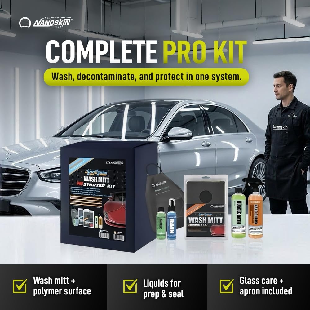 Kit includes: AUTOSCRUB Wash Mitt Medium Grade, BUBBLE BATH Wash & Shine Shampoo 16 Oz., NANO SHOCK Hydrophobic Lubricant Sealant 16 Oz., RAIN PREP Glass Activator/Cleaner Conc. 2 Oz., RAIN Glass Sealant 2 Oz., NANOSKIN Detailing Apron