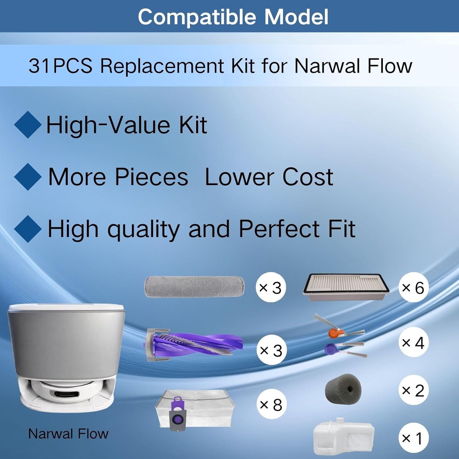 Replacement Accessories Parts Kit Compatible with Narwal Freo Z Ultra - Includes 8 Dust Bags, 8 Mop Pads, 8 Filters, 8 Side Brushes, 2 Rubber Main Brushes,2 Baseboard Rags