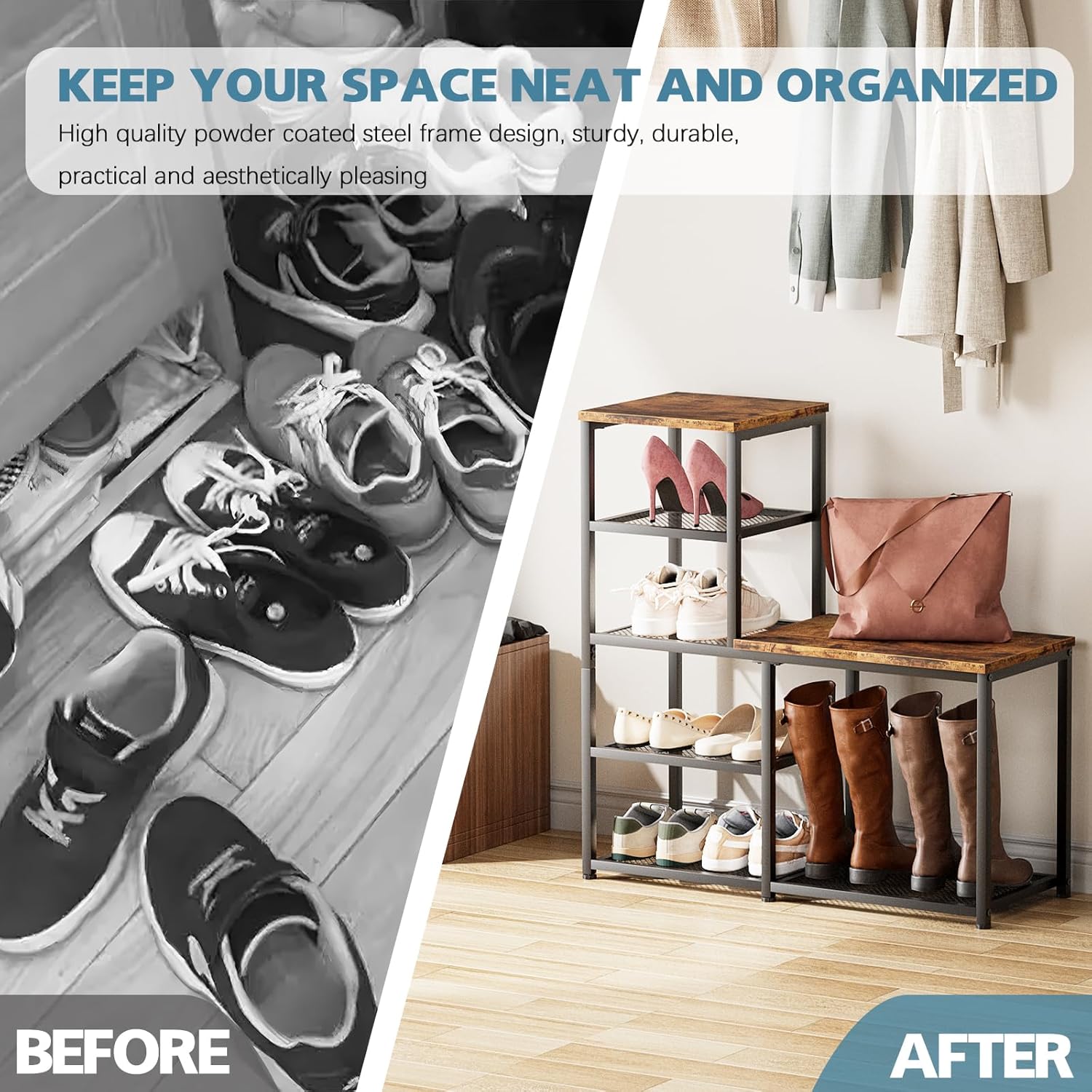 ✔Multi-Use Shoe Bench : This shoe rack organizer is a combination of shoe rack and bench helps you to save space. Shoe rack 4 mesh shelves can hold for your 13-15pair normal shoes as well as a tall compartment for your snow boots, work boots or taller items;Top wood shelf is perfect for storage boxes,Bag, key, storage tank,purse, hats or other sundries.