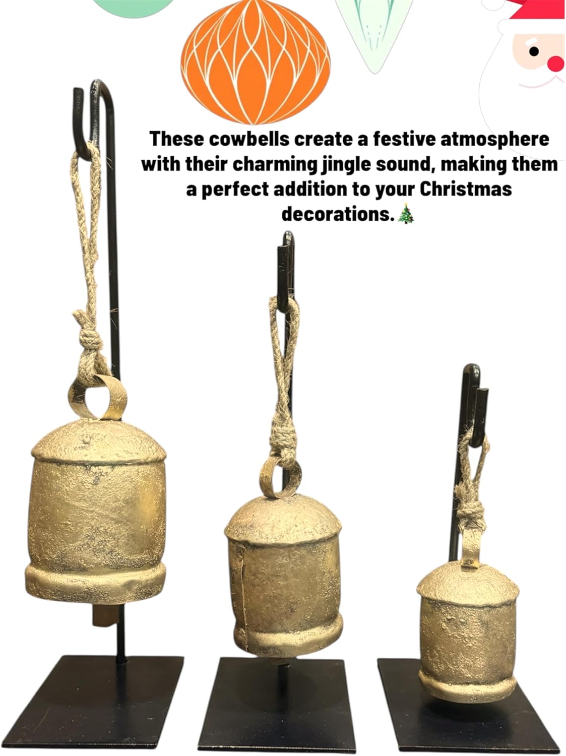 Each piece in this rustic set of 3 decorative bells for home decor is expertly welded from durable iron, securely attached to a sturdy stand, and features a beautifully positioned brown wooden clapper for added charm and sophistication. Satin gold decorative bells for holidays are beautifully shaped to resemble classic bells on rectangular base, complementing various decor styles. Wipe clean with a dry cloth. Perfect for living rooms or bedrooms, this bell set of 3 meditation bell adds a touch of rustic charm by placing them on a console, coffee table, or side table. Designed with felt or rubber stoppers at the base that prevent scratching furniture and table tops, as well as sliding around. This item ships in 1 carton. Round chair is fully upholstered in a polyester fabric. Can be leaned against the wall vertically. Suitable for indoor use only. This item ships fully assembled in one piece. Made in India. This gold colored iron meditation bell comes as a set of 3. Rustic style.