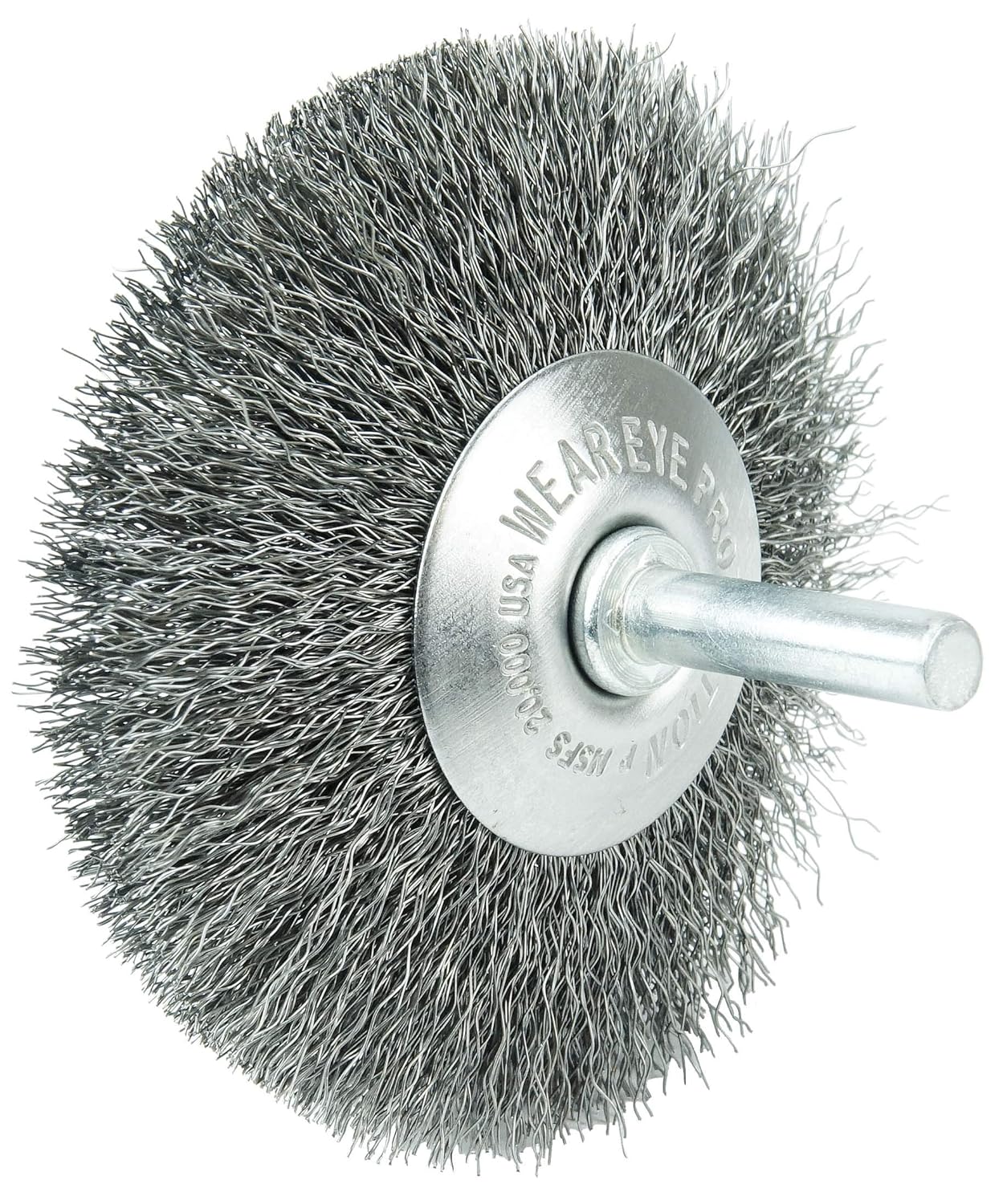 Weiler 3" Stem-Mounted Concave Crimped Wire Wheel provides a flexible brushing action for addressing corners and hard-to-reach areas on stainless steel. The permanently-attached 1/4 in stem are intended for use on CNC,/Milling/Automatic Machines, Die Grinders, Drills, Drill Presses, Right Angle Die Grinders and Straight Grinders. Although they can also be mounted onto a drill, the speed and power of that tool will decrease the effectiveness of the brush. Featuring Weiler's solid ring construction, these radial wheels are available in heat-treated steel, type 302 stainless steel and brass wire Engineered and manufactured to maximize performance and minimize operating costs in the most demanding surface conditioning applications. The use of superior construction, the highest quality materials and the most stringent manufacturing processes deliver the lowest cost-of-use and most consistent performance in heavy production environments. Made in the USA.