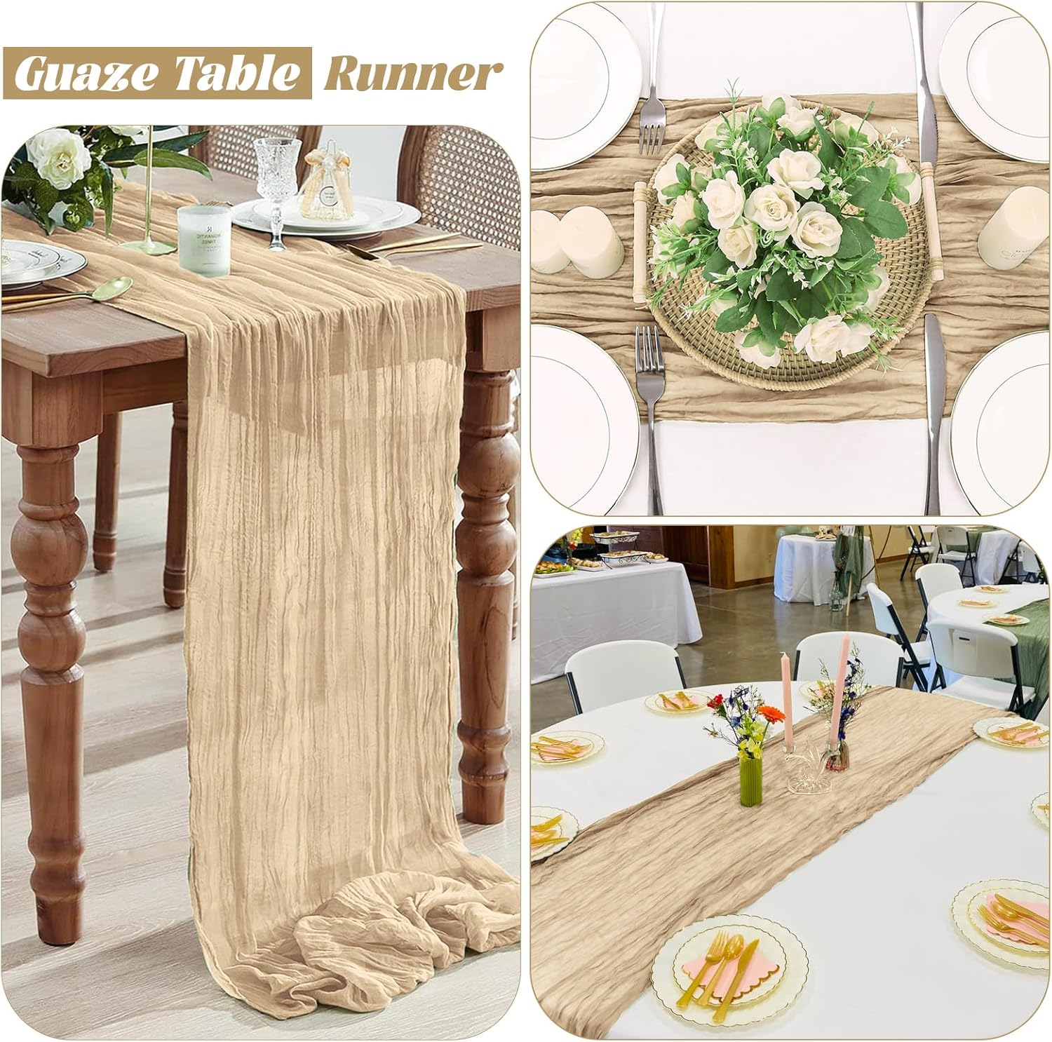 Sheer Rustic Cheesecloth Table Runners Product InformationPackage includes: 20 packs cheesecloth table runnersColor: beigeMaterial: High Quality PolyesterDimensions: 35x70 inchesBeige Table Runner Features:1. Our Gauze Cheese Cloth Table Runner made of 100% High quality gauze, The gauze table runner has Beautiful folds, the cloth is exquisite, the seam is firm, and the feel is soft. 2.Let the delicate and airy table runner drape gracefully across your table and flow onto the floor,which adds a romantic atmosphere to your wedding or special events,flowy and dreamy.3.If it is dirty after use, you can hand wash it with a mild detergent in cold water. Please use a laundry bag if machine washing, lay flat or hang to dry.Widely Use:perfect for weddings, parties, baby showers, woodland baby showers,hunting baby showers, arch curtains, Easter, Christmas, birthdays or any other event you want to celebrate, adding a romantic touch and creating a warm party atmosphere.Excellent service:If you have any questions, please feel free to contact us,
