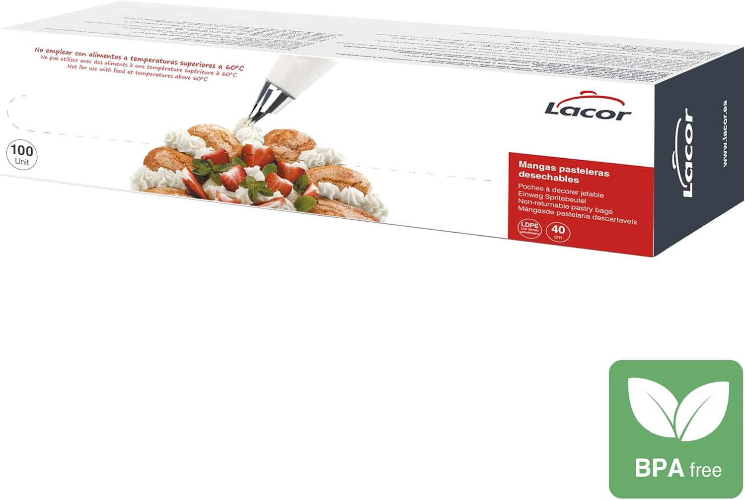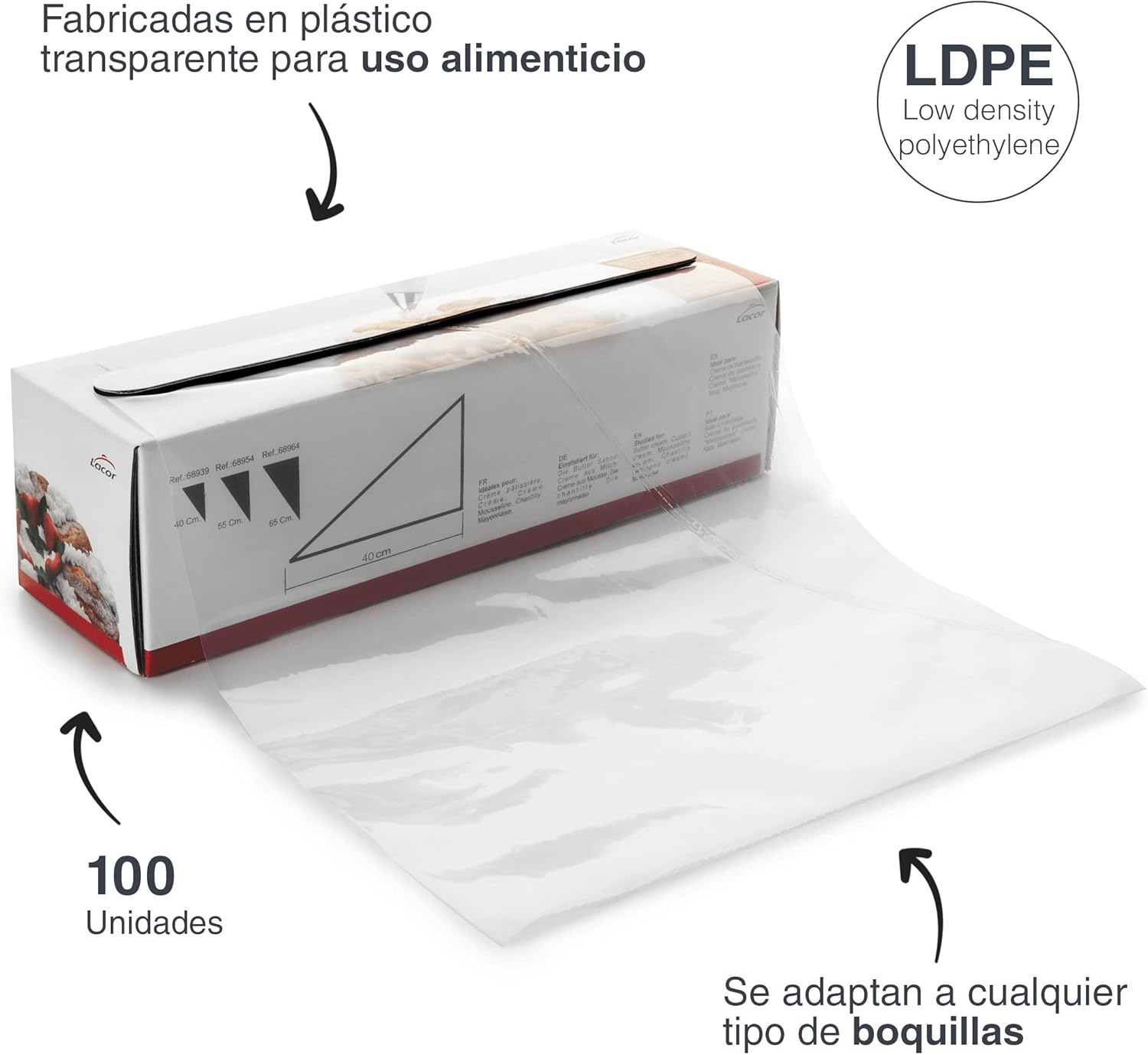 Disposable sleeve ideal for decorating cakes with cream, cream or meringue, filling doughnuts, combs and making biscuits, made of transparent elastic (280 gauge) for food use, high capacity and very resistant, use for cold creams or aftertaste non-serum at 60 °C, with the disposable sleeve you will have the confidence that no food contaminations will be rouded.