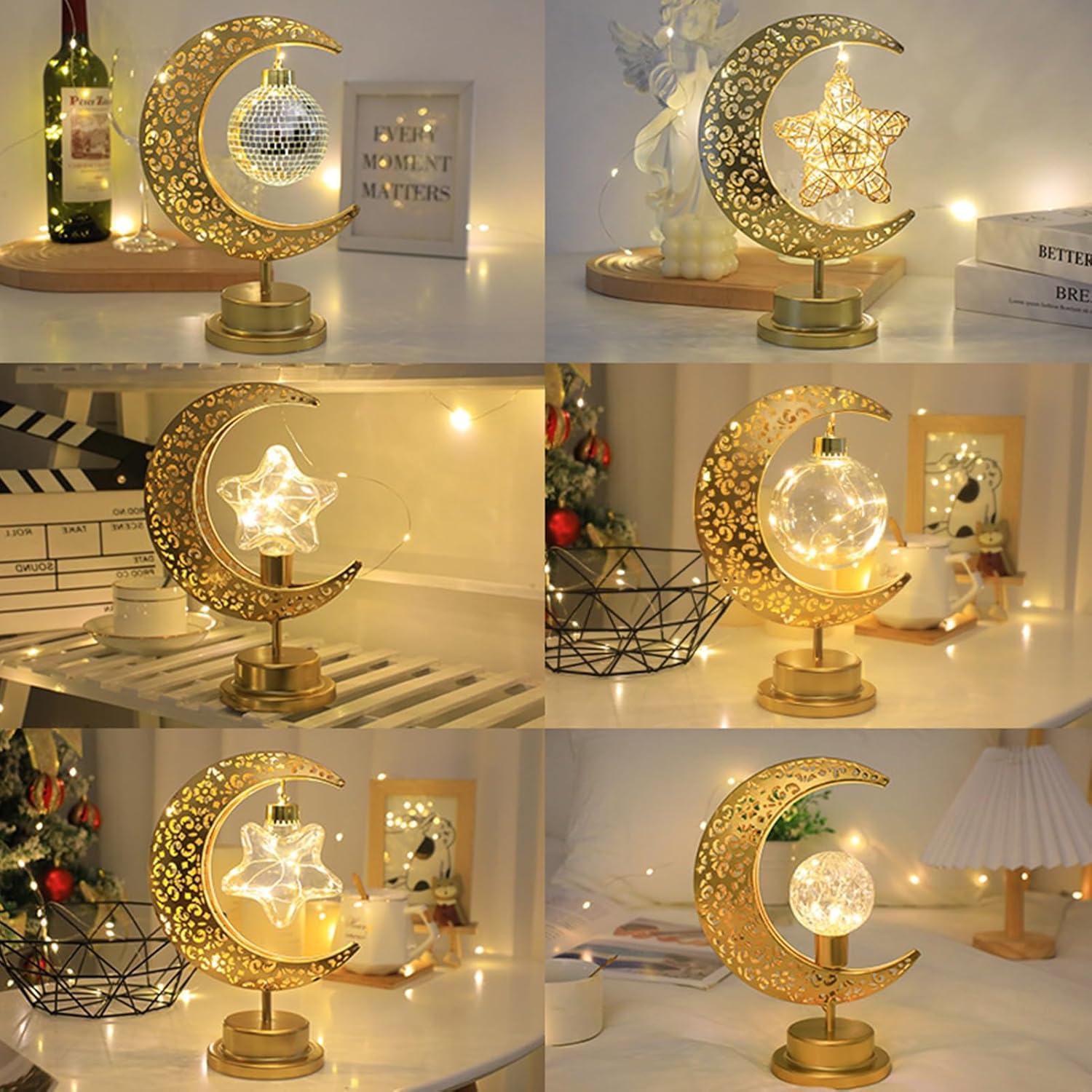 Description: Introducing the LED moon lamp, a charming and stylish addition to any room. Emitting a warm yellow light with just the right brightness, this night light provides soft and gentle illumination, perfect for creating a cozy while protecting your eyes.With easy battery operation, simply install batteries and press the moon light button to turn it on โ no electrical connections required for added safety. The unique and stylish LED design of this metal star and moon lamp adds a touch of fashion and retro beauty when lit, making it a perfect bedroom light or holiday decoration.Not only does this star-shaped table lamp serve as a functional light source, but it also doubles as a decorative piece that easily catches the eye. Whether used as a table lamp, children's bedroom night light, or simply as a decorative item, the moon hollow desktop style lamp is sure to delight and enhance any space.It also doubles as a thoughtful gift for special occasions such as birthdays and Christmas, charming both children and adults alike with its warm glow. Don't miss out on this lovely gift that no one can resist! Material: Wrought Iron, Plastic Battery: 3 x AA Batteries(Battery Not Included) Size Details: One Size A, L: 27cm/10.63", W: 17.5cm/6.89", H: 10cm/3.94" (Approx.)One Size B, L: 27cm/10.63", W: 17.5cm/6.89", H: 10cm/3.94" (Approx.)One Size C, L: 27cm/10.63", W: 17.5cm/6.89", H: 10cm/3.94" (Approx.)One Size D, L: 27cm/10.63", W: 17.5cm/6.89", H: 10cm/3.94" (Approx.)One Size E, L: 27cm/10.63", W: 17.5cm/6.89", H: 10cm/3.94" (Approx.)One Size F, L: 27cm/10.63", W: 17.5cm/6.89", H: 10cm/3.94" (Approx.) Package Includes: 1 x LED Moon Lamp