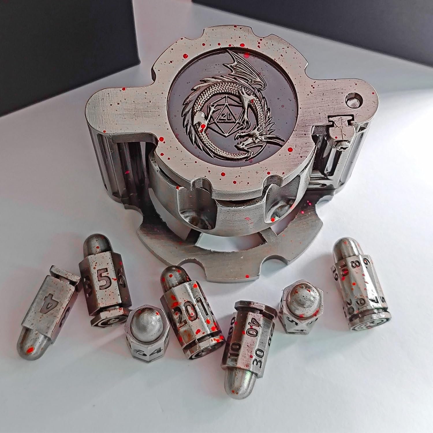 Handheld spinner design for convenient tabletop gamingSpecifications:Revolver Container Size: 2.6in/7cm X 2in/5.3cmBullet dice size: 0.43in/1.1cm X 1.06in/2.7cmMade: MetalColor:Black gold/Copper/Black/BloodstainsProduct Includes:1XSpinning Revolver Cylinder Dice Container1XD20, D12, D10, D%, D8, D6 and D4 bullet shaped polyhedral DND diceNote:1.Please allow slight dimens error due to manual measurement.Thank you for your understanding !2.Due to different monitors and different lighting, the picture may not show the actual color of the item.Thank you for your understanding.