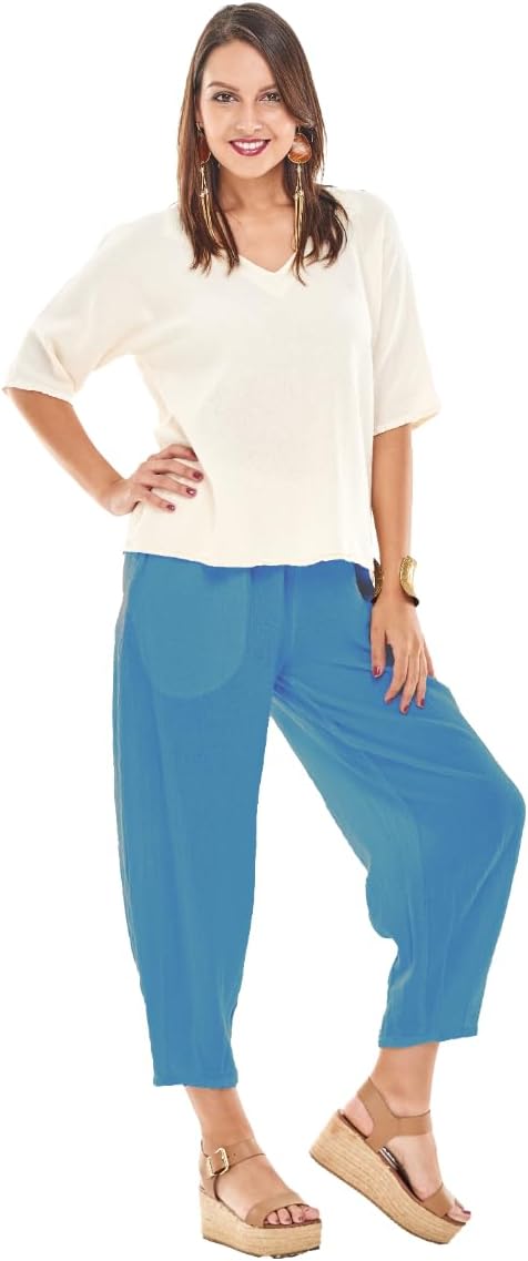 A shorter full cut cotton gauze pant with tapered (dart) hemline.