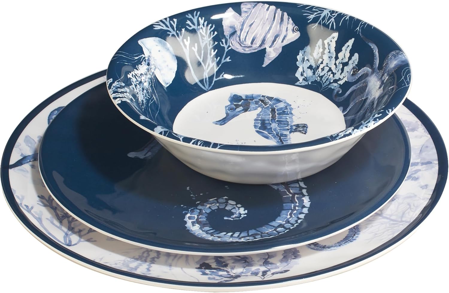 Set sail with every meal using the Sea Life Melamine 12-Piece Dinnerware Set, designed to bring the calming beauty of the ocean to your table. This all-in-one set includes four dinner plates, four salad plates, and four all-purpose bowls—each featuring breathtaking marine artwork in soft indigo hues. From swirling jellyfish to graceful seahorses, the collection captures the elegance of life below the sea. Made from durable, BPA-free melamine, these pieces are chip-resistant, lightweight, and dishwasher safe—perfect for indoor or outdoor dining. Whether you're enjoying a quiet family dinner or entertaining on the patio, this set provides a complete and coordinated look. Its high-gloss finish enhances the nautical details while resisting stains and fading. Stackable for easy storage, it's a must-have for beach homes, boats, and summer getaways. Bring harmony, function, and oceanic style to every setting with this cohesive dinnerware set.