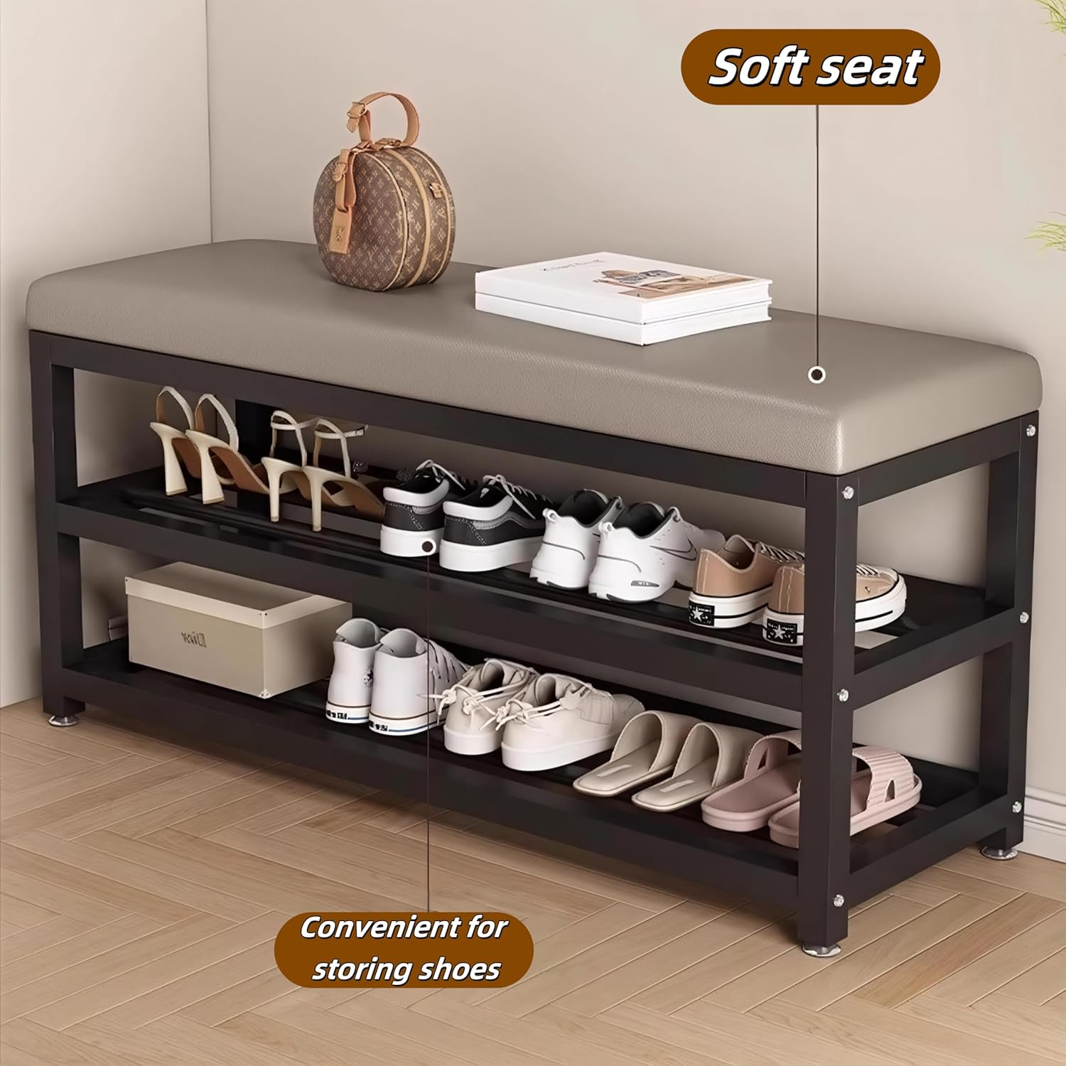Stylish and Functional Shoe Bench This versatile shoe bench with storage brings a fresh look to your entryway or bedroom. The padded seat offers comfortable support while putting on or taking off shoes, while the sturdy metal frame with multi-tiered shelves keeps your shoes neatly organized. Space-saving yet spacious, the multi-compartment design maximizes vertical storage without taking up much room—perfect for tight entryways or bedroom corners. It keeps high-traffic areas tidy while adding a stylish touch to your decor. Whether you need a dedicated spot for your growing shoe collection or a convenient place to sit while changing shoes, this storage bench combines practicality and comfort in one.