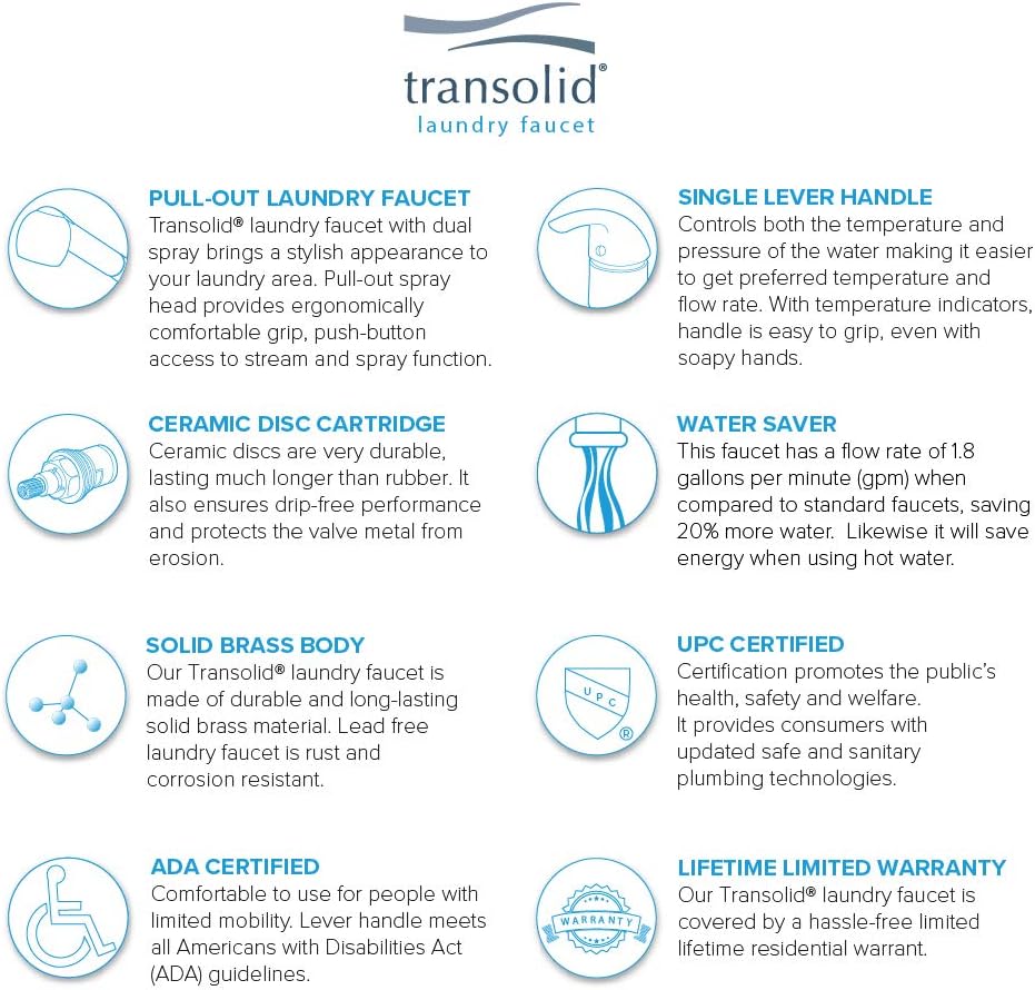 Single lever handle. Dual function pull-out spray. Swivel spout. Brass construction. Ceramic disc cartridge. 1. 8 gpm max. (6. 8L/min. ) - saves 20 percent more water. Flexible supply lines with 3/8th compression fittings. Installation in a single 1-3/8th diameter hole. Polished Chrome finish. Lifetime ltd. . .